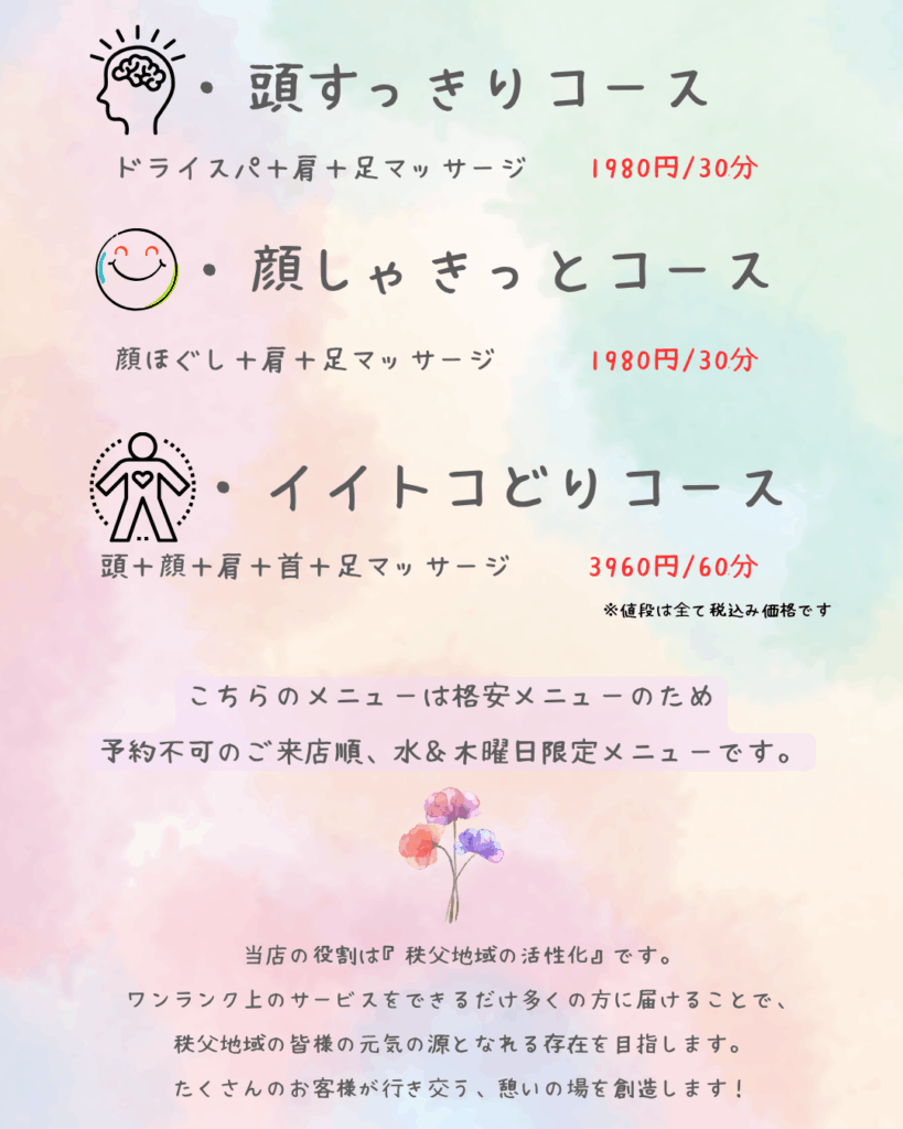 頭+顔+肩+首+足マッサージ     3960円/60分